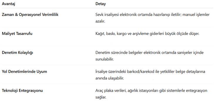 Elektronik İrsaliye (e-irsaliye), kağıt sevk irsaliyesi ile aynı hukuki geçerliliğe sahiptir ancak elektronik ortamda hazırlanır, iletilir ve saklanır. Bu sayede: